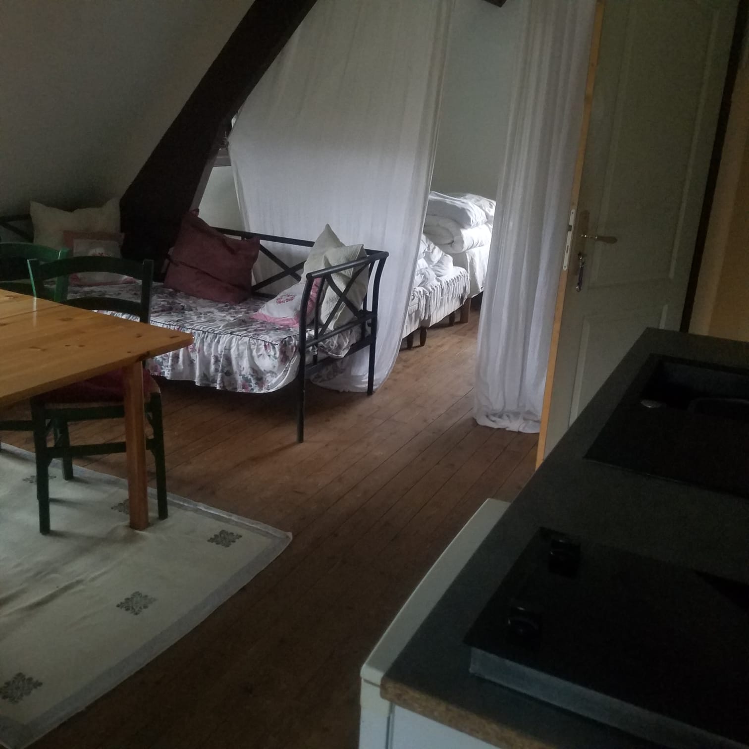 - Appartement mansardé de 38m2 situé au deuxième étage de la bâtisse- ancien hôtel des années 30 situé à mille mètres de la mer et 20 mètres du riverside walk GR26 qui vous y conduit- disposant de deux chambres et d’un dortoir avec 3 lits permettant l’hébergement de huit personnes, d’un coin bureau, d’une cuisine équipée, d’un salon avec canapé, table, chaises + téléviseur et d’une salle de bain.